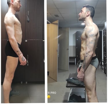 Atleta di pugilato, si è affidato a me per migliorare la composizione corporea e risolvere i dolori alla schiena causati da una postura in estensione. Dopo un anno di lavoro su forza muscolare, allungamento e respirazione, i risultati parlano chiaro: